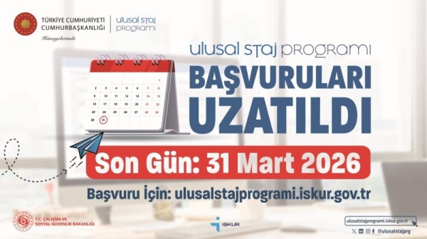 Cumhurbaşkanlığı Himayelerinde Türkiye İş Kurumu (İŞKUR) koordinasyonunda 2026 yılı “Ulusal Staj Programı” öğrenci başvuruları 06 Ocak 2026 tarihinde başlamış olup 31 Mart 2026 tarihi saat 23:59’a kadar devam edecektir.